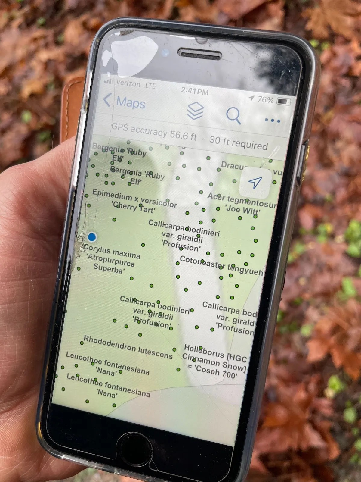 The plant that we pulled up was one that eluded Roy's ability to identify. Instead he pulled out his phone and opened a folder titled "Nature" containing apps for plant identification, invasive species, etc. He opened the identification app and crouched to point it at the ground. We tried a few angles and it still eluded him. So, in this case, the "data" in the collection was illegible to all of us. We knew it was some plant, but nothing more. (Perhaps not dissimilar from finding an errant, unmarked book in a library off of its shelf). In one last attempt, he opened up a private map made of the arboretum showing where all the plants are. Clearly a crucial digital representation to complement the on-the-ground signs and tags hanging off branches.