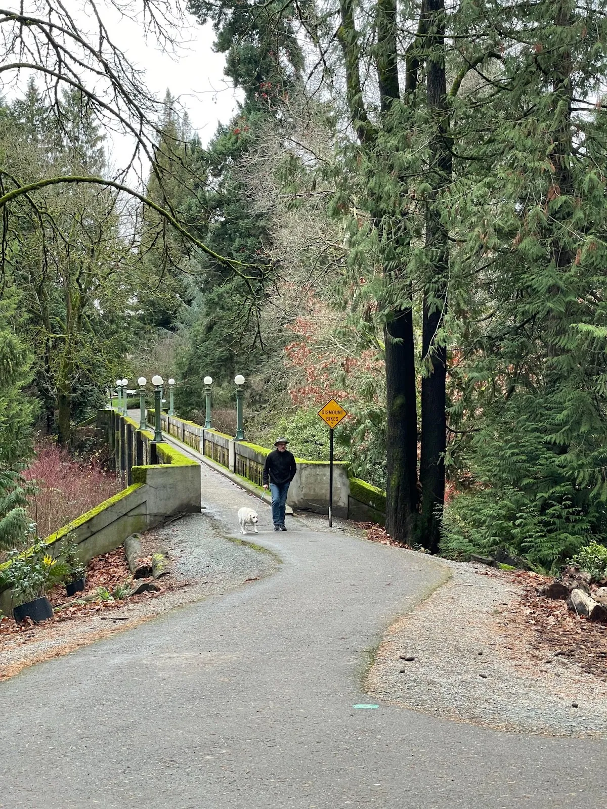 As Azalea way reached its end, I could tell I was beginning to feel more soothed by the plants around me. Perhaps this feeling was shared by the others in the park? On this main thoroughfare occasional walkers would pass by. A couple sporting puffy jackets and beanies, rapt in conversation. A man with his shaggy white dog, entering a park via a charming old bridge shrouded in moss.